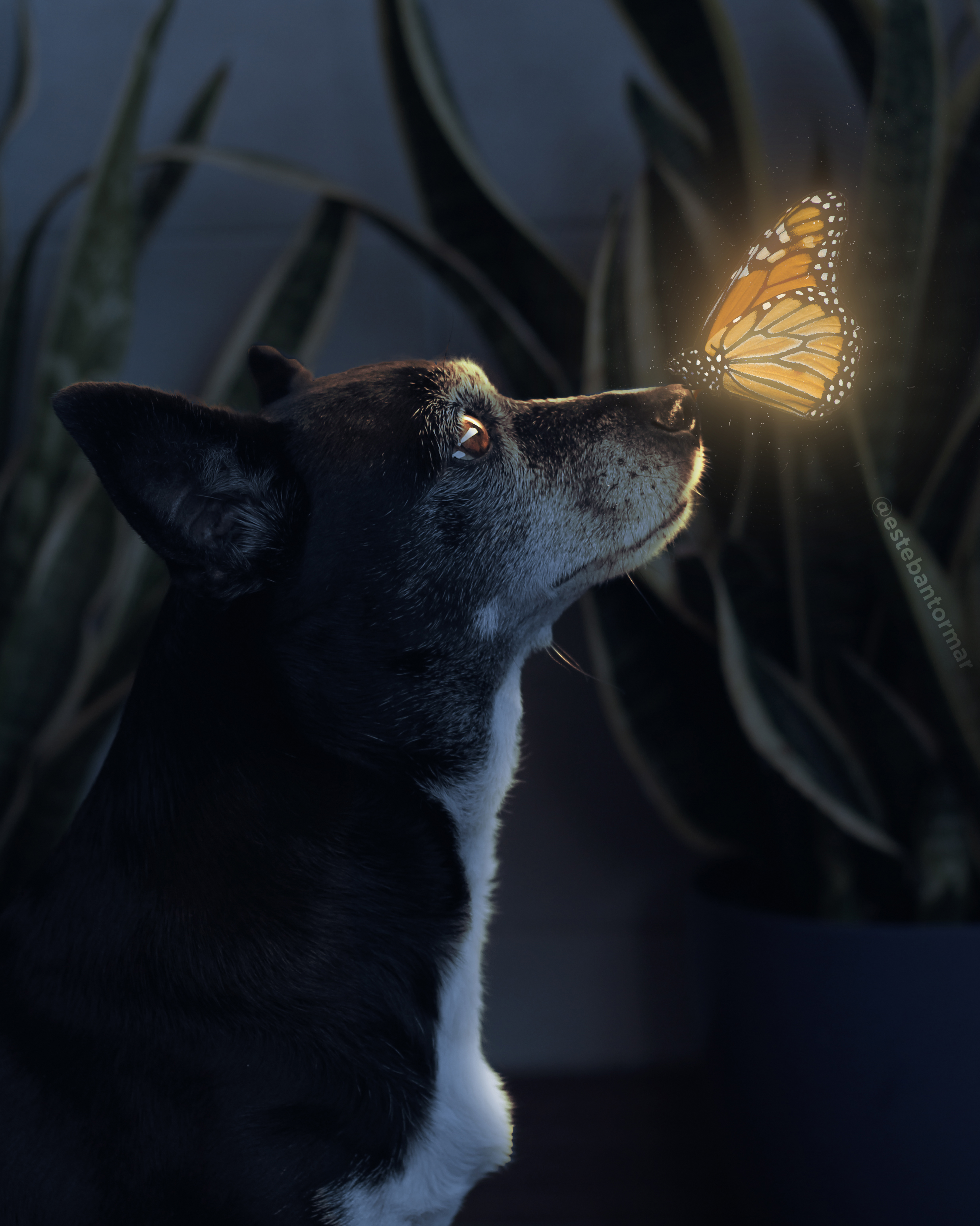 Este es montaje de fantasía en el que retrato a mi perra mirando a una mariposa brillante.