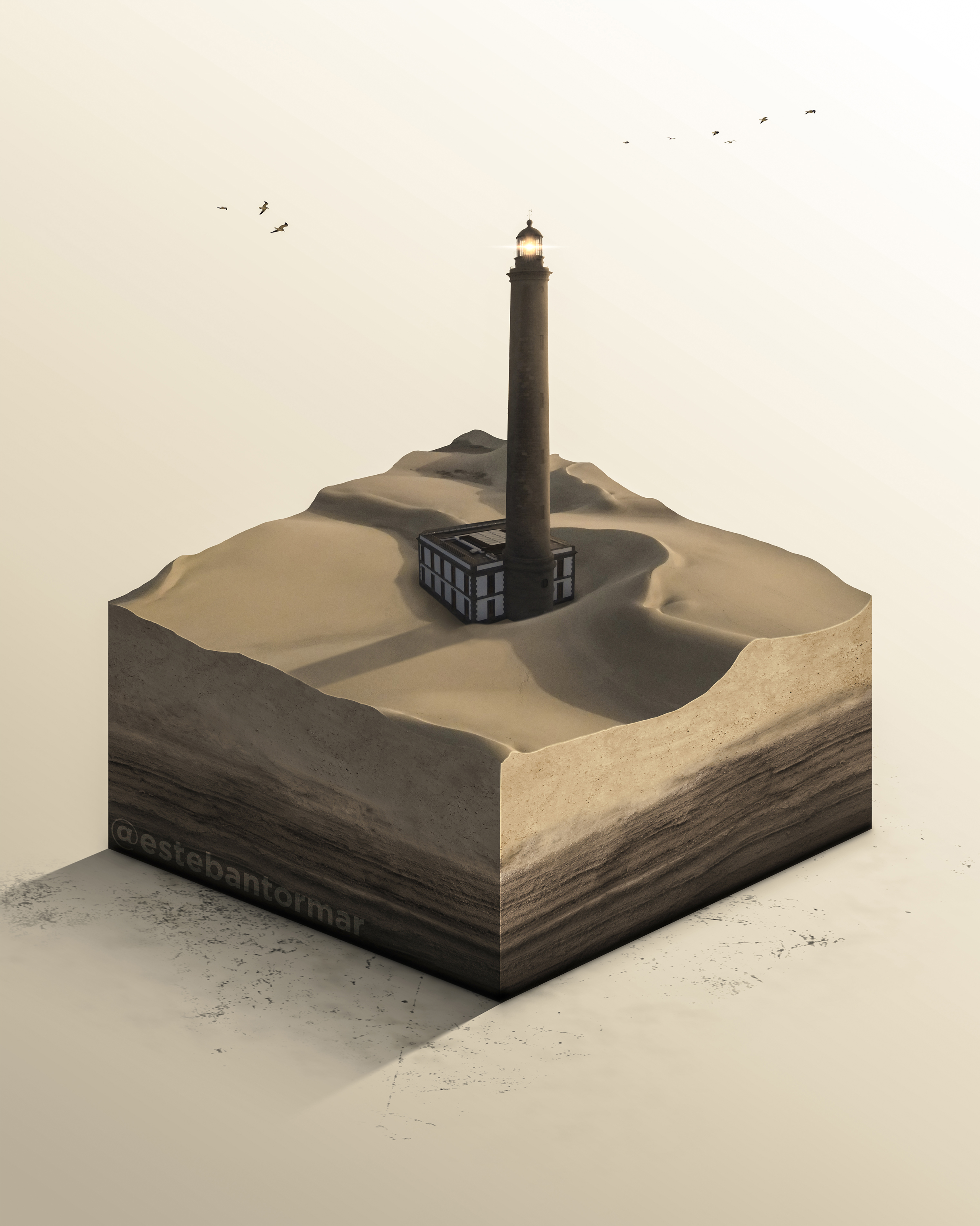 Montaje del Faro de Maspalomas embebido en la arena que compone las Dunas de Maspalomas. Inspirado en @microworldsofficial.